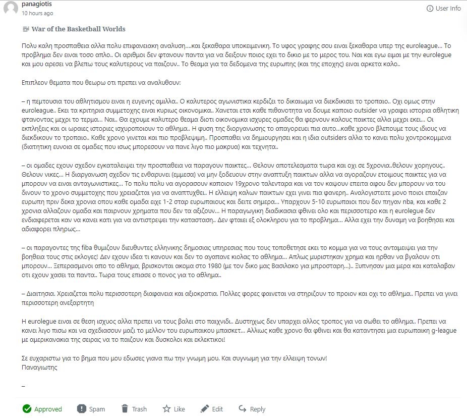 Απλά για να απαντήσω στο φίλο, το λέω και στο άρθρο ότι δεν επιθυμούσα να καταδείξω ποιος έχει δίκιο και ποιος άδικο σε αυτή τη διαμάχη, ούτε να έχω ρόλο δικαστή. Αυτό στο οποίο προσπάθησα να επιχειρηματολογήσω είναι ότι οι κατηγορίες της FIBA προς την Euroleague σε κάποια θέματα, τελικά δεν ευσταθούν.