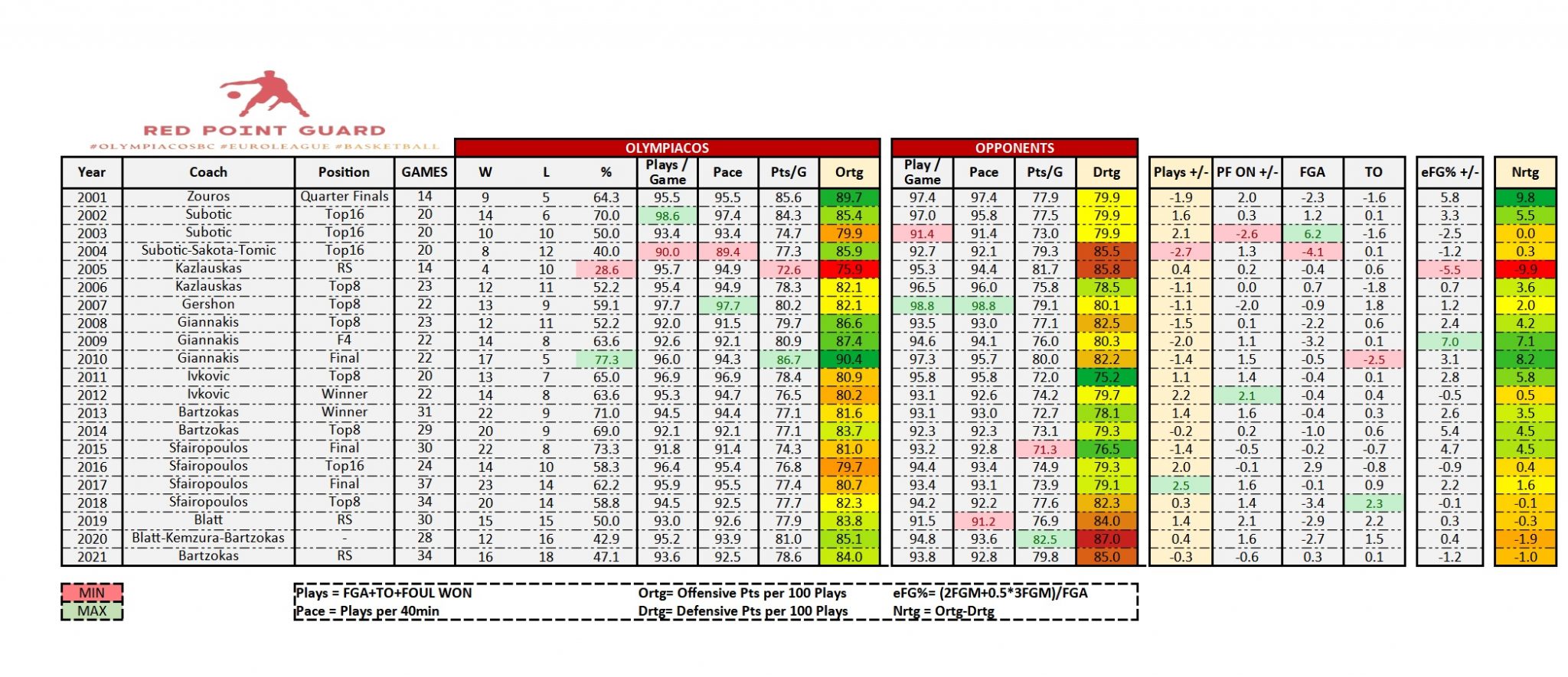 Αυτό από μόνο του δεν μας λέει πολλά εκτός του ότι η άμυνα μας ήταν χειρότερη από την επίθεση μας. Το μόνο σίγουρο είναι ότι και στις 2 πλευρές του παρκέ αποδίδαμε κατώτερα από τον φετινό μέσο όρο της διοργάνωσης. Όμως ας επικεντρωθούμε στην δική μας ομάδα και μόνο. Για μια ομάδα όπως ο Ολυμπιακός με εμπειρία 20 ετών στην διοργάνωση το επίπεδο είναι γνωστό. Γι αυτό και στις 12 από τις 20 συμμετοχές του από το 2001 και έπειτα βρέθηκε τουλάχιστον στα Play Off. Όταν λοιπόν αναφερόμαστε σε ένα Powerhouse της διοργάνωσης όλα έχουν ως σημείο αναφοράς την δική του απόδοση. Με αυτό το δεδομένο η απόδοση του Ολυμπιακού ιστορικά είναι ένας αξιόπιστος δείκτης σύγκρισης.